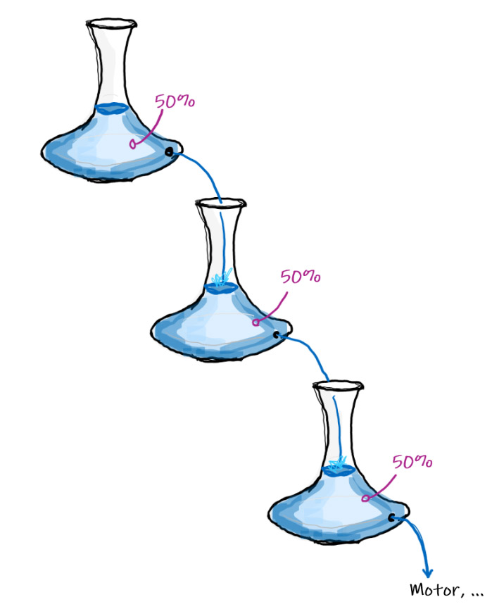 So, if now all have exactly the same capacity (SOH, later articles), and all start at the same filling height (voltage), then all of them have the same starting content (SOC). If current flows through the cascade, each cell in this perfect example is being filled/emptied by the exact same amount of liquid. If you keep discharging them, they all approach 0% SOC simultaneously2. Vice versa, if you keep filling them up, they all will be 100% full at the same time.